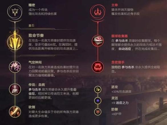 最适合泽丽的符文有致命节奏和征服者,符文点法和常规ad类似,我更倾向于致命节奏,叠满增加的射程特别好用。队伍伤害足够砍倒可以换成致命一击,也有贪欲猎手换成灵性猎手为了频繁触发耀光特效的点法。我第一盘泽丽觉得q不耗蓝可以不带气定神闲,但其实we前期特别耗蓝,气定神闲还是有必要带的,如果你不缺蓝也可以换成其他两个。