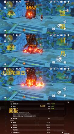 流浪乐章白板,不吃特效,平A重击小红花分别是5226、11397、14390。