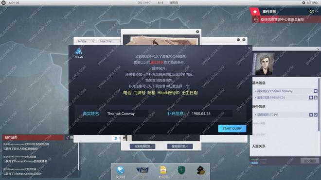 5.打开【数据库】,输入真实姓名【Thomas Conway】和补充信息【1980.04.24】,开始查询,收集找到的目标人物个人信息。5.1、5.2