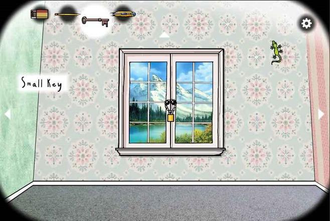 屋子里唯一能用上钥匙的就是这扇锁着的窗户了。打开窗户,发现景色不过是墙纸,没什么好说的,拿起刀子我们就把墙纸怼开!