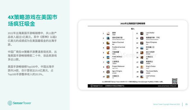 2022年出海美国手游畅销榜中,共11款产品收入超过1亿美元。其中《原神》以超2亿美元的成绩成为在美国最吸金的出海手游。中国厂商在4X策略手游赛道表现优异,出海美国手游畅销榜前二十中,该品类游戏多达12款。美国手游畅销榜Top100中,中国出海手游共24款,合计营收达25.6亿美元,占Top100手游整体收入的20.5%。