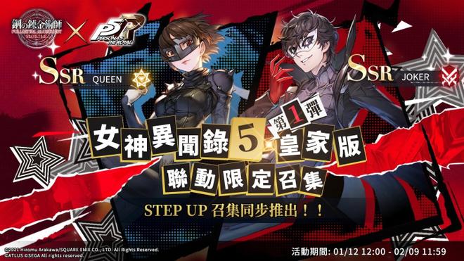 即日起至2月9日活动期间,将举办「女神异闻录5皇家版联动限定召集第1弹」活动,粉丝们期待的SSR角色「Joker」和「Queen」正式登场,华丽揭开与《钢之炼金术师M》的首次合作!