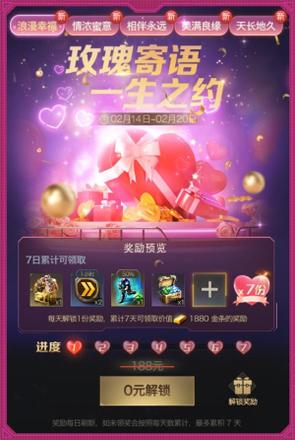 (浪漫幸福、浓情蜜意、相伴永远、美满良缘、天长地久);奖励分为解锁奖励和礼包奖励,解锁奖励购买后立即获得,礼包奖励在活动期间解锁后每日可领取,并且礼包奖励可累计领奖。未解锁累积每日刷新的奖励,在解锁后可一次性领取累积奖励且后续天数刷新领奖机会时可继续领取;已解锁未领取也累积天数奖励。