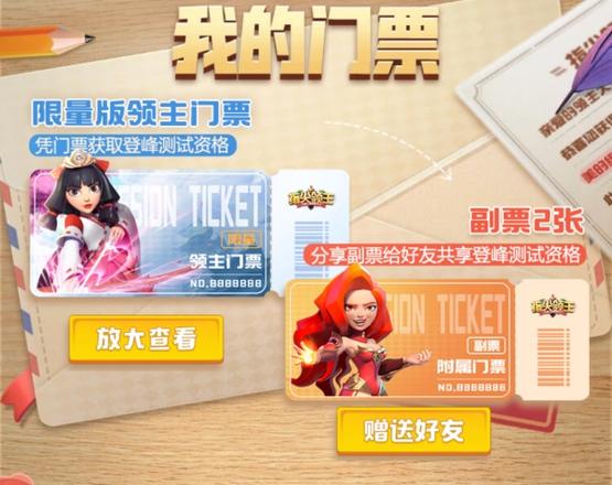目前,“登峰测试”专属资格发放活动现正火热进行中,每日2000张“限量版领主门票”等你来领!抢到“门票”的玩家,还能获赠2张专属“副票”——分享“副票”给好友,即可为TA激活游戏测试资格,享受相同的福利和待遇。