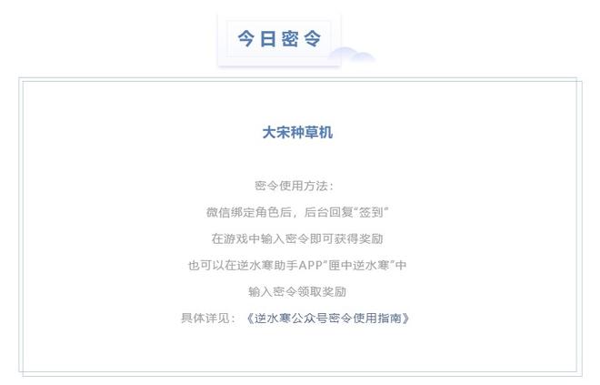 在逆水寒的官方公众号里,每日都会发放一个密令,玩家通过这个密令可以游戏里兑换奖励,那么这个游戏的每日密令都是什么呢,很多玩家都不太清楚,不知道密令是什么的小伙伴就跟着手游技术攻略网小编一起来了解一下吧。