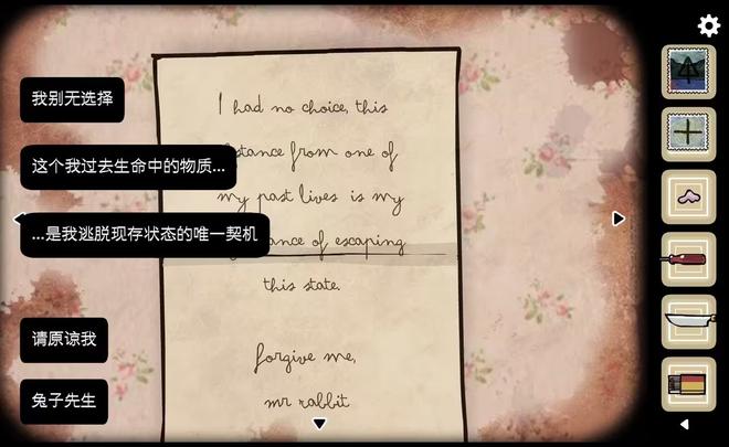 4、父母视角,点击左侧桌子上的盒子,里面好像有什么东西被拿走了,我们合上盒子获得盒子上的银币,盒子前是兔子先生留下的信。