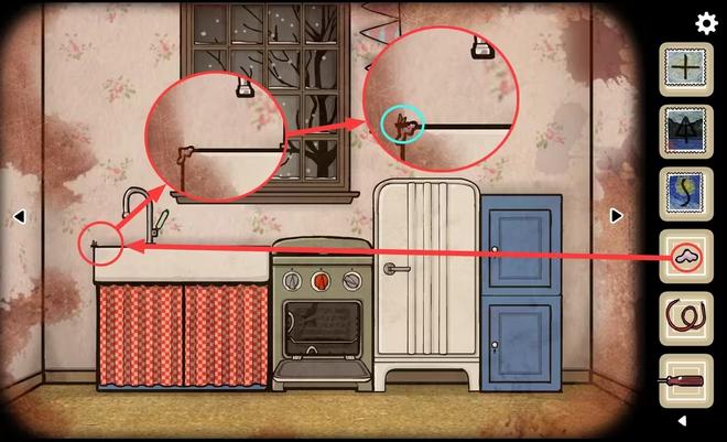 16、厨房视角,将母亲嚼过的泡泡糖黏在水池左侧的角上,切出视角后再点击水池,那只从柜子里飞出来的苍蝇被黏住了,点击获得。