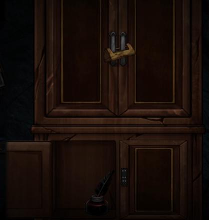 7.继续向右走查看柜子,以相框背面图案对照笔记最后一页的颜色,调整柜子下面左边柜门锁打开左下柜子,获得【钥匙】【杯子】,用【没墨的钢笔】获取墨水获得【有墨的钢笔】。