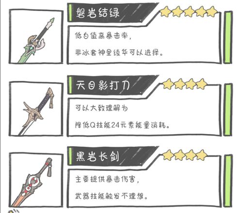 ①除以上3把武器之外,在队伍有迪奥娜等护盾角色时,斫峰之刃(需搭配护盾)也是可用的。还可以选择磐岩结绿(暴击)、波乱月白经津(暴击)、黑剑(暴击)、风鹰剑等作为备选。