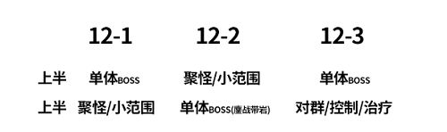 Tip:部分角色练度凑不出12层两队BOSS战专用单切队伍的小伙伴,我们可以不考虑“三间连打”。先将单切最强的这队放在上半,对群/基础爆发伤害/控制能力比较好的另外一队放在下半。