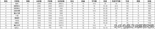 评价方式:选择每个兵种的最终形态,AI价值与战斗价值之和除以2就是综合价值,并且以综合价值进行排序。