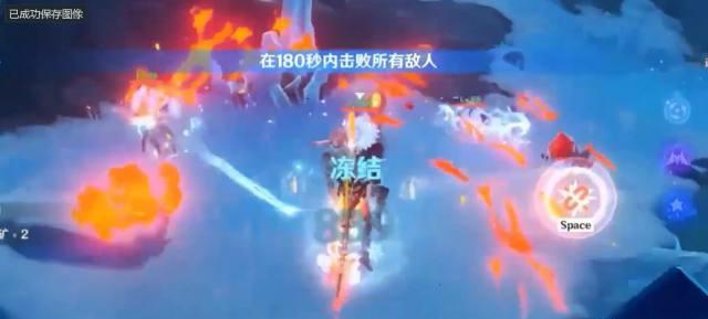 6、来到星莹洞窟入口处,一路向下来到最低端的冰池,开启冰池中间的限时挑战,完成挑战后就可以开始找深赤之石打冰晶了。