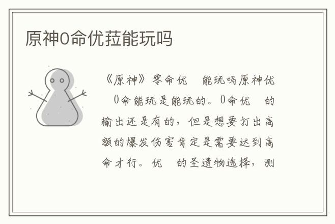 原神优菈0命能玩是能玩的。0命优菈的输出还是有的,但是想要打出高额的爆发伤害肯定是需要达到高命才行。优菈的圣遗物选择,测试下来效果最好的是苍白4件套,当然也有很多玩家会选择使用苍白2件套+染血2件套这样的组合,但。