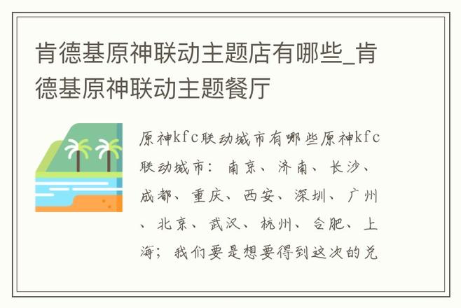 原神kfc联动城市:南京、济南、长沙、成都、重庆、西安、深圳、广州、北京、武汉、杭州、合肥、上海;我们要是想要得到这次的兑换码的话是可以去门店里面购买对应的套餐的哦,很多城市都是有的,而且要自己去门店买才。