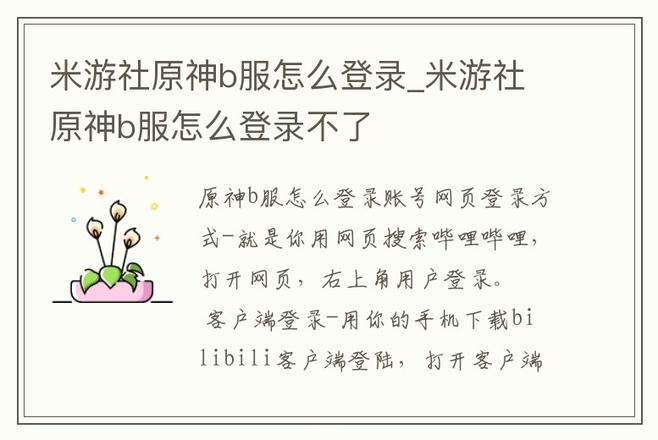 在实际生活中,很多人可能想了解和弄清楚原神b服怎么登录账号这个问题?那么关于原神b服怎么登录账号答案我来给大家详细解答下。原神b服怎么登录账号 网页登录方式-就是你用网页搜索哔哩哔哩,打开网页,右上角用户登录。2。