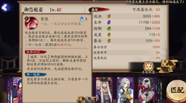大招雪恨(3火):攻击敌方目标三次,每次攻击造成72%伤害。然后攻击敌方全体一次(如果开启了封印结界再增加一次),每次造成72%伤害。可以获得3层【仇恨印记】(唯一效果)。大招需要回合预热来叠加印记。仇恨印记:sp般若的特殊机制,上限9层,满了以后自动解除自己所有控制效果并且增加35行动条。开启结界的话,无法获得仇恨印记。这个技能和鬼切的技能真实很像了。