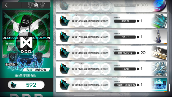 任务里程碑。收集黑曜石完成任务里程碑,不同数量有不同的奖励,其中部分奖励是门票和扭蛋代币。