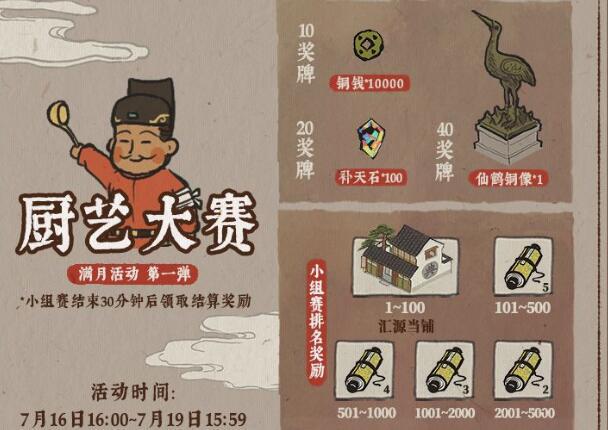 江南百景图满月庆活动开始结束时间就是在7月16日下午的4点开始,而结束时间就是在6月19日的下午4点之前,不过要是玩家错过了这个活动的话也不用心急,因为这个满月庆厨艺大赛的活动在游戏里只是这次活动的第一阶段,在后面也是会有很多活动值得玩家参加的,不过玩家要是错过这次活动建筑的话,就是等以后看看有没有机会复刻了,毕竟这这些道具也没有说绝版。