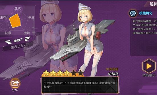 中途岛在游戏中的等级是四颗星,相对来讲不是很容易获取,她的定位是正舰,装备重甲,拥有超远程的射程。在队伍中,中途岛更偏向于辅助,当战斗发动的时候,每次队伍中的其他舰姬有消耗能量的行动,中途岛都会将这次所耗能量积分数相应地转化为舰队的耐久值,转化的标准是能量积分数的一千一百,两千六百和四千一百。此外,如果队伍中的旗舰为中途岛时,会在这个初始值上额外增加一千五百点。