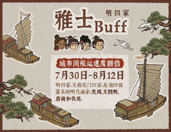这个明四家雅士buff是用于提升城市间航运速度的。开放苏州的玩家都知道,有时候资源不够需要利用船运来从应天府调取物资,而每调取100个物资就需要花费1小时的时间,在雅士buff加成期间,航运速度将会翻倍,也就是说原本运输100资源所需要的时间现在可以运送200资源了。极大的减少了玩家调取资源需要等待的时间,对于新城市的建设来说无疑是一大助力。