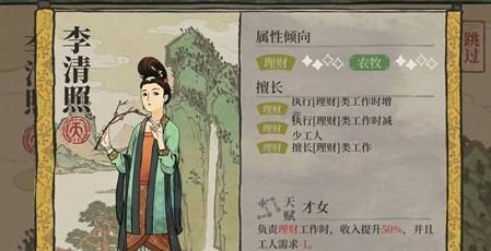 天赋才女,效果是在所有【理财】类型的工作中,获得的铜币可以提升50%,对于前期积累铜币有很大的帮助。