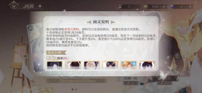 SSR卡面的初始爆料是2%,相较于很多游戏来说是比较高的概率了,并且如果可以触发保底的话还会更高。游戏中有对于新手玩家的福利,前20抽必定会出一个SSR画灵,因此想要入手SSR并非一件难事。
