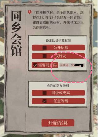 玩家打开同乡会馆界面,可以创建队伍,并且在队伍创建界面查看同乡码。当玩家勾选招募权限为“仅限同乡码”的时候,后面就会显示一串数字,这就是玩家队伍的同乡码了,将它分享给好友即可搜索到你的队伍并完成组队加入。