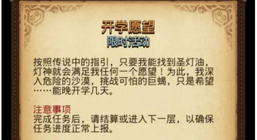 不思议迷宫开学愿望圣灯油就是需要玩家在沙漠绿洲这个地图里面60层以上的时候击败BOSS才可以获得,所以玩家也是需要多关注一下这个情况,毕竟只有这样玩家才可以获得钻石的奖励,不过玩家在刷这个地图的时候最好就是使用冒险者还有雅典娜和匹诺曹专业的组合,这样就是可以让玩家快速的完成这个活动。