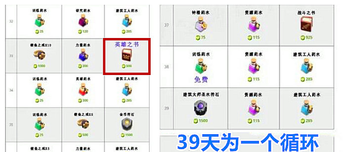 如果我们布局整个图表,英雄之书在39天周期会“刷新4本书”,训练药水在39天周期会“刷新5瓶”。说的有道理,因为英雄四本书是39天刷新,所以每10天刷新一次,但是第6天刷新的英雄书会在第16、20、33天循环,所以如果你想追上英雄书,