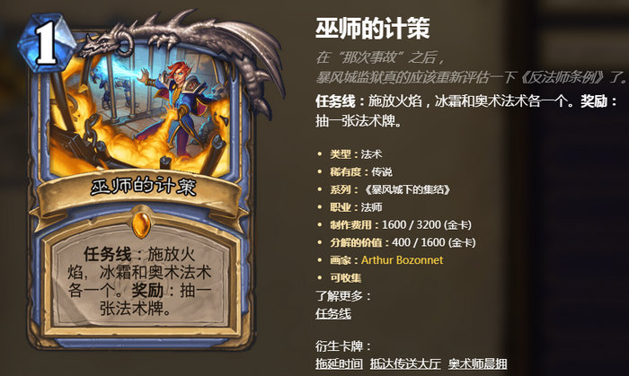 首先我们从法师的任务卡上看到了两个关键词,“那次事故”和暴风监狱,说明这个新版本的时间线是关于兄弟会事件和暴风监狱暴动的分界点(暴风监狱副本)。因此,根据这一点和每个版本每个职业固定两个橙子的特点,我们基本可以推断出盗贼除了一个任务线之外,很可能会得到一张像牧师一样的大传说牌(牧师橙牌已经公布,是黑暗主教本尼迪塔斯)。