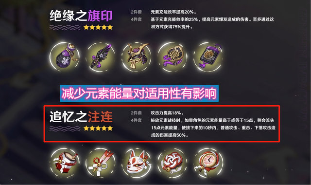 首先,主要的效果和用法!的两件式属性,会提升百分之十八的攻击力,跟角斗士差不多,像那些喜欢使用基础攻击的角色,就特别的符合,当然玩家们还能将其,拆分成两件套使用(刷的区域比较广),甚至可能导致特效。另一方面,四件套属性是角色的能量高于十五点的时,就会瞬间流失十五点元素能量,但在接下来的十秒内,普攻,重击和下落攻击造成的伤害会提升百分之五十(增幅的倍率,不算太夸张),触发效果的机制,还是很苛刻的释放战斗技能元素后的。我更愿意称之为“能量泄漏集”,在这种情况下,它会与那些喜欢用大招的角色发生碰撞。这就导致了局限性,但如果你想灵活运用,还是可行的。毕竟有元素充电效率。只要玩家让角色完成大招,在辅助的帮助下恢复一些能量,就可以全部吃掉。过程比较复杂,建议当时好好学习。