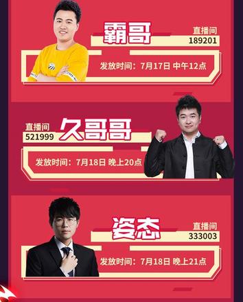 首先第一个频道,也就是虎牙主播莎莉, 小超梦, 霸哥,九歌和姿态的直播间,会随机发放激活码。莎莉,作为常年的顶级国服宝座,相信很多玩家还是非常熟悉的吧。毕竟,路人王的称号不是说说而已。小超梦和霸哥不用多说,一个是实力上的单身主播,另一个是“混子”;长兄的话,他的妖姬也很深刻;最后是姿势。作为曾经的职业球员,他的人气不用多说。