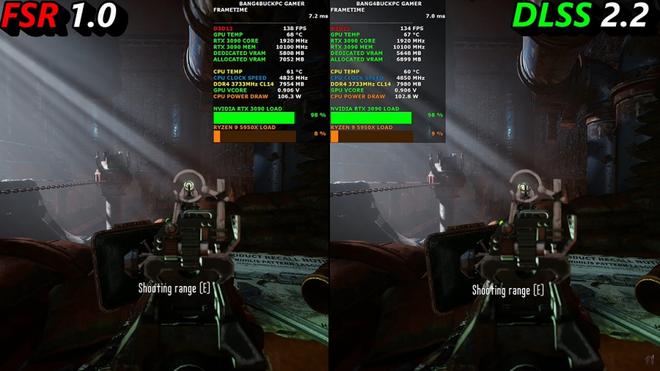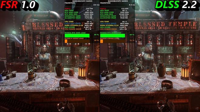 视频游戏中,DLSS 2.2设置为画质模式,FSR设置为超画质模式,分辨率为4K(2160P)。从视频来看,4K分辨率下,无论是DLSS还是FSR,画面的细节基本都不会丢失太严重。在帧数上,锐龙9 5950X和RTX 3090主要由3UP使用,所以在DLSS和FSR的加持下帧数可以达到120帧以上,有些场景甚至可以达到130帧以上。