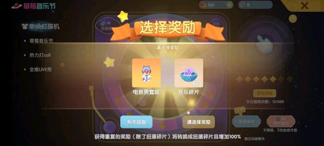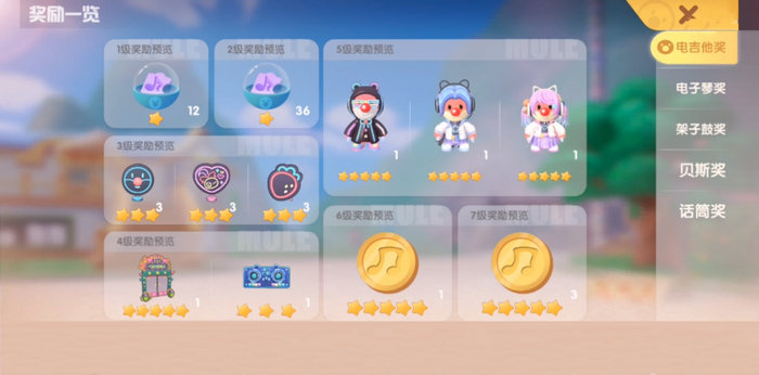 首先可以发现,摩尔庄公园的幸运CD机里有五种“乐器”,也是用六枚硬币提取一次,然后随机“升星”,最高的也是七星,甚至附加机制都一样,还有免费的普通附加。