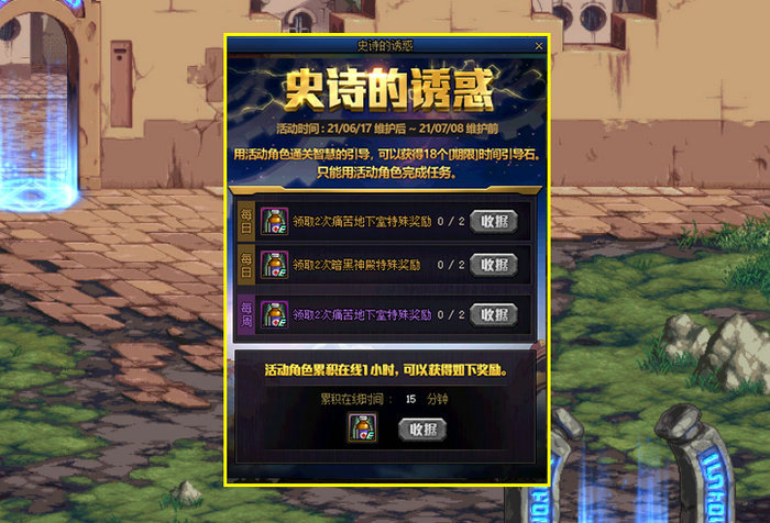 同时活动开始后,玩家在线累计一小时,还可以给一瓶50分疲劳秘方。活动持续了3周,也就是说可以获得45瓶疲劳药剂(16点),再加上一瓶50点疲劳药,可以“白嫖”97把深渊。