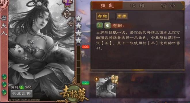 最近有几个新英雄穿上了三国杀体验服。南华,老仙和吴景都有一定的实力和很高的可玩性。但是,除了以上两位,还有一位女武将,刘备的夫人糜,夫人,这次糜夫人被政府指定为“精品”,她的技艺与很多武将相匹配,总体来说还不错。