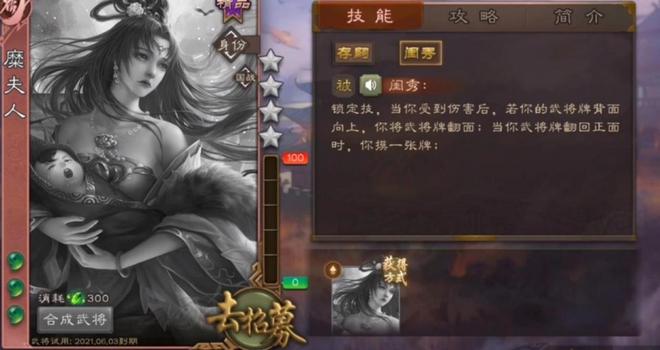 糜夫人的第一个技能是“拯救继承人”,它可以主动翻身,让一个军事指挥官得到一次杀死,然后下一次杀死将伤害1。第二个技能“闺秀”是锁定技能:回前摸牌,伤了回前。