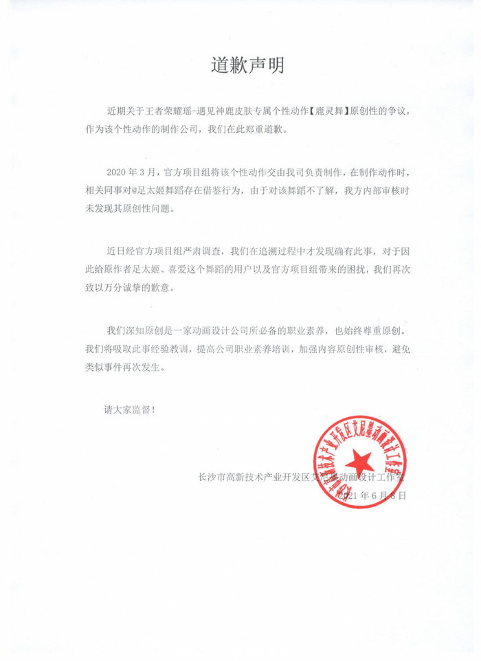 这个动作是由一个叫做艾尼墨动画设计的工作室制作的。6月8日,王者荣耀官网发布了这份声明,称该动作的确存在大量借鉴的行为,因此不止对原创的作者进行了致歉,还会在接下来的时间里对该动作进行重新的设计,在新动作上线之前,已经拥有该动作的玩家将无法使用这个动作。