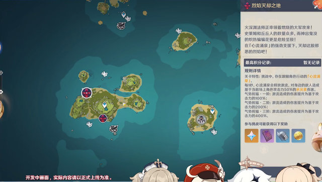 【烈焰灭却之地】关卡特性效果!在这个关卡的介绍中提到了“心流泉”,这其实就是这个关卡的特色效果。官方预告中提到,在无休止的突战中,每个关卡的位置都不一样,关卡的主题、效果、加持都不一样。烈焰灭却之地这关的特性效果是:在挑战中会存在一个跟随角色行动的【心流涌泉】。每一秒心流涌泉都会释放激流,对身边的敌人造成基于当前场上角色攻击力50%的水元素伤害。,这就是为什么以前有人说,虽然水角色在这个级别上有优势,但不练习水角色的玩家仍然不用担心。【流泉】相当于一个自动水属性伤害,还是射程型。每秒一次的攻击频率完全够用,做出反应什么的也没问题。不过这个50%攻击伤害其实有点低。