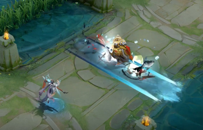 三个技能还是召唤两条锦鲤在水道中跳跃翻腾,会溅起少量的墨沫。这不是脏水坑,而是水墨画的特点和设计。在跳跃的过程中,水道会留下鱼形的轮廓。