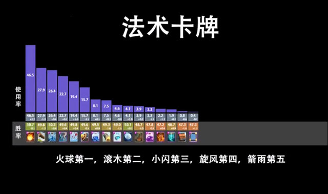 然后是法术卡,因为这次调整没有法术,所以使用率没有大的变化。火球作为全能之王,依旧有着第一的使用率,依旧遥遥领先。之后有滚木和小闪电。这两张卡可以说是两种费用,使用率相当,但使用方式完全不同,都走出了自己独特的市场。然后是飓风法术和箭,一个是功能性法术,另一个是三阶段攻击。你想怎么玩由你决定。有趣的是,毒药法术已经失宠,不再像以前那样流行了。