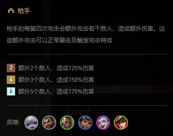 4枪手:枪手的每第四次攻击会额外攻击若干敌人,造成额外伤害.这些额外攻击可以正常暴击及触发攻击特效.(额外3个敌人,造成150%伤害)
