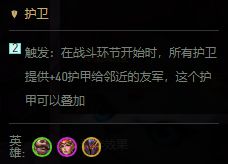 2护卫: 触发:在战斗环节开始时,所有护卫提供+40护甲给临近的友军,这个护甲可以叠加。