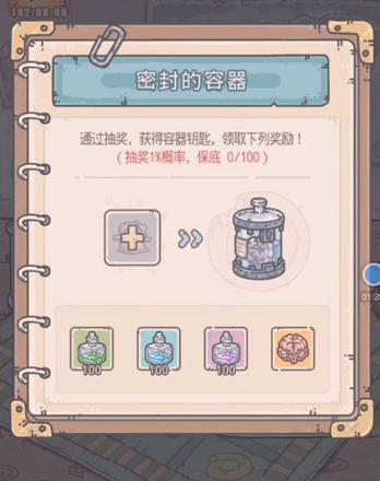 最强蜗牛密封的容器有什么用?密封的容器是在光子服最新上线的抽奖彩蛋,更新过后就在抽奖机旁边可以查看,如下图所示,玩家需要通过抽奖机抽奖来获取容器的钥匙,容器钥匙是一个绿色的贵重物品,玩家有1%的几率抽到并且保底100次必出,还是比较容易获得的。获取容器钥匙后可以开启容器,获取下图中的奖励物品。