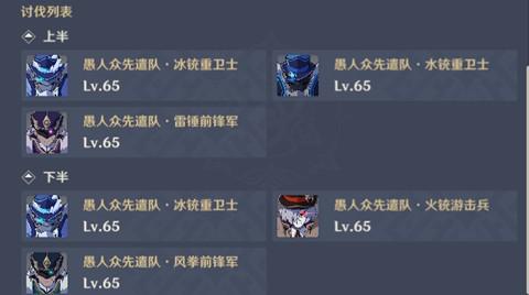 上半场火雷水冰元素,根据自身培养的角色选择,下半场必带火/冰元素,其他没有特殊要求,1辅助1输出就可以了。