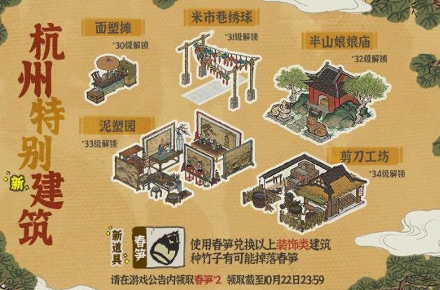 江南百景图面塑摊是一个装饰类建筑物,是小伙伴们装扮和建设杭州城的重要元素。详细的入手途径上,小伙伴们需要获取和拥有新道具——春笋,如此可以兑换和获得。其中,春笋含有两种入手办法,第一种是在10月22日23:59分前通过游戏公告领取(2个),第二种是通过种植竹子概率产出和掉落,门槛一般。