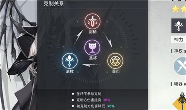 解神者神格分为四个职业类型,分别是剑柄、星币、法杖以及圣杯。其中,剑柄克制星币,星币克制法杖,法杖克制剑柄,圣杯则不在克制关系之内。需要指出的一点是,一旦对战双方构成克制关系,那么克制方伤害提高20%、被克制方伤害降低20%。也就是说,克制一方将占据极大的优势,获得伤害和免伤BUFF。