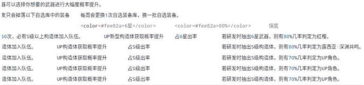 在游戏里面,深红之渊卡池的概率虽然显示的是80%,但是这个概率是玩家抽到S级角色的时候才有80%的几率是露西亚深红之渊这个角色,不过这要是按照卡池出S角色的几率是1.9%来计算的话,玩家想要出这个角色也是很难的。