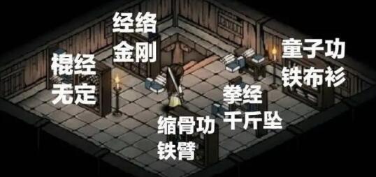 功法名称书架位置经络金刚左上书架童子功,铁布衫最右书架棍经无定最左书架缩骨功,铁臂最下面的书架拳经千斤坠右边中间的书架