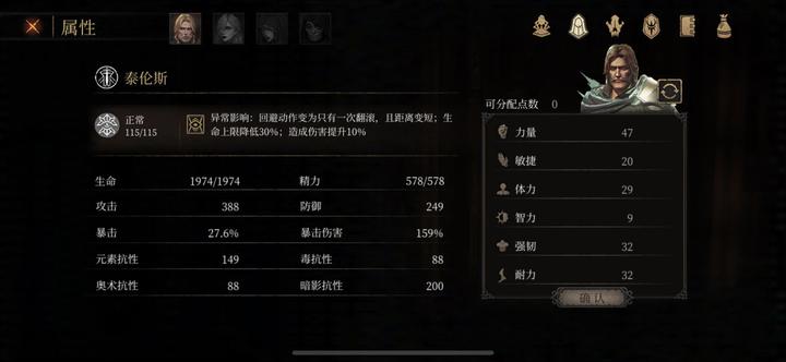 武器为双手剑,主属性力量。在游戏前期建议可以先加点耐力,一般来说在15级前加点5耐力就够了。然后可以继续加力量和体力。力量是提升伤害的主要属性,如果不加点力量的话后期会输出不足,需要一直使用提高输出的药剂来不足伤害。